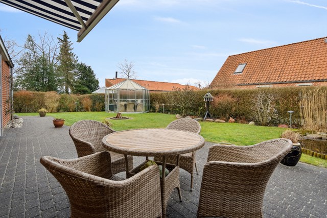 Haven byder på mange hyggelige kroge, hvor du kan nyde solen fra morgen til aften. Der er også en stenbelagt terrasse med mulighed for overdækning fra de to elektriske markiser.