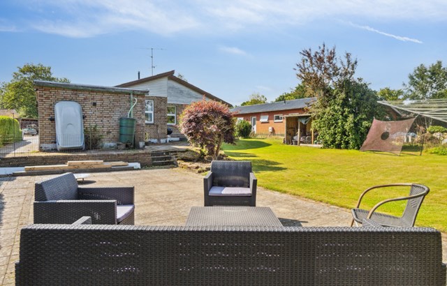 Haven er stor og breder sig omkring huset med græs på begge sider, og opvoksede træer og buske bidrager til den stemningsfulde atmosfære. Der er også en terrasse i bunden af haven, som fanger solen fra samtlige vinkler.