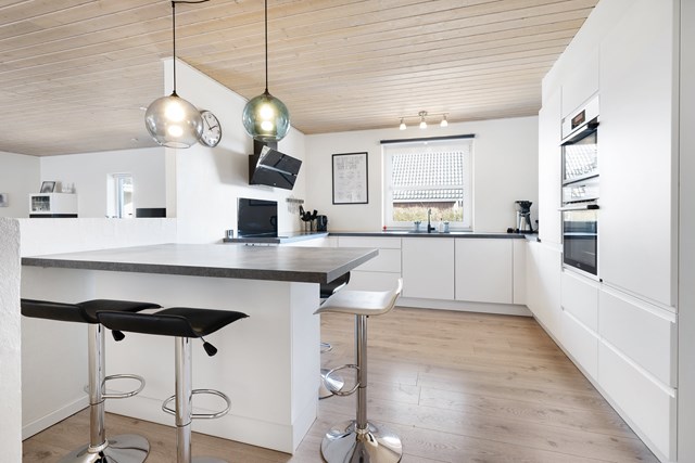 Foto: Lyst køkken i åben forbindelse med stuen/alrummet