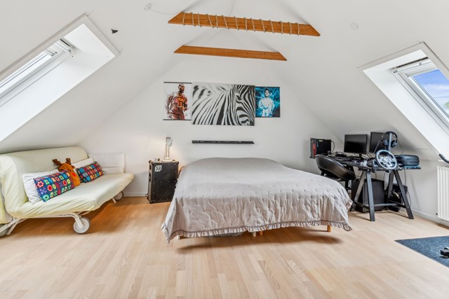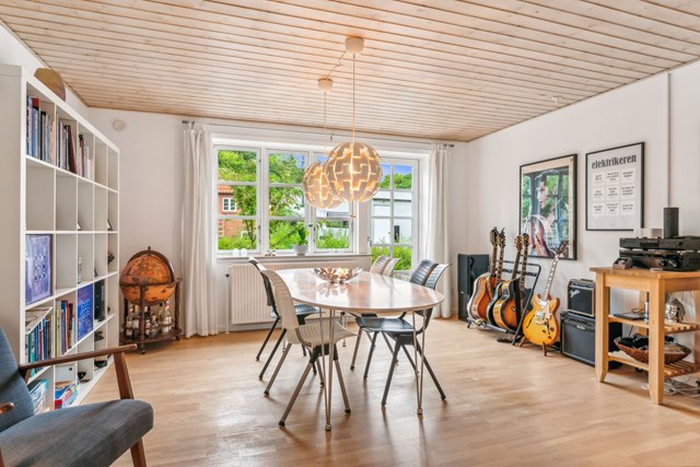 Her er desuden åbent til kip og store vinduespartier, der sørger for et generøst lysindfald og et behageligt indeklima ovenpå.Planløsningen i stueetagen opdeler de forskellige afdelinger med to værelser i den ene ende og de store opholdsrum i den modsatte ende.