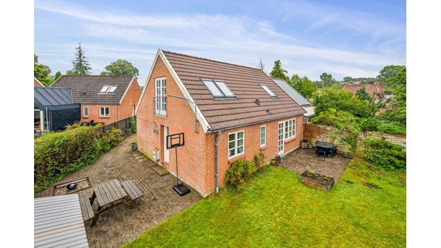 Boligoplevelsen fuldendes af det skønne udemiljø, der gemmer på en overskuelig, lukket have. Her er en fin, lille græsplæne, en høj hæk, som sikrer jeres privatliv samt et dejligt terrassemiljø rundt om tre af husets sider; her kan vi fremhæve den vestvendte fliseterrasse, som er det perfekte sted at fange middags- og aftensolen.