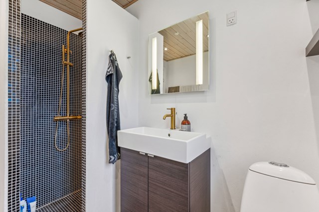 Køkkenet er indrettet i varme nuancer med mørke bordplader, der skaber en flot kontrast med køkkenfronterne af træ, og her finder I alle de nødvendige hvidevarer. Badeværelset har separat brus med rainshower, og slutteligt kan vi oplyse, at hvor der er fliser, er der gulvvarme.