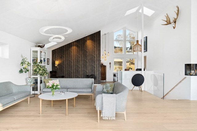 Hjemmet byder på hele 5 værelser, hvoraf 4 har direkte adgang til terrasser. Hovedattraktionen er dog de foldbare terrassedøre, der fylder hele breden af huset og kan trække naturen og udsigten lige ind i stuen.