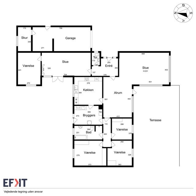 Køkkenet ligger i forlængelse af spisestuen, og drømmer du om et stort køkkenalrum, kan din drøm blive til virkelighed her! Fra spisestuen er der adgang til boligens terrasse fra år 2021. Herefter fører en fordelingsgang til tre af husets værelser, bryggers og badeværelse.