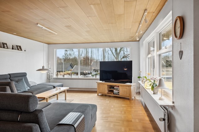 Allerede ved første øjekast præsenteres du for en privat og tilbagetrukket bolig med plads til flere biler i indkørslen. Fra husets entré kan du træde ind i husets hjerte, de to forskudte stuer, der giver en god fordeling mellem tv-stue og spisestue.
