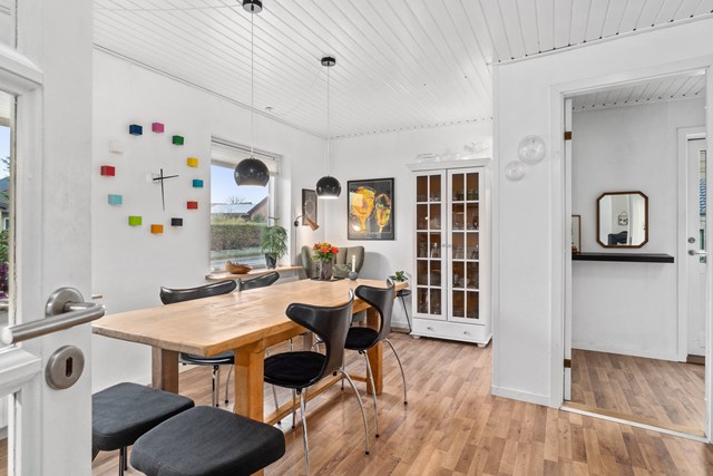 Stueplanet byder på et køkken-alrum og en stor vinkelstue med fletparket, som indbyder til både fælles madlavning og hyggelige stunder. Den store stue drager fordel af sollyset fra sydøst vendte vinduer, som skaber en lys og indbydende atmosfære.