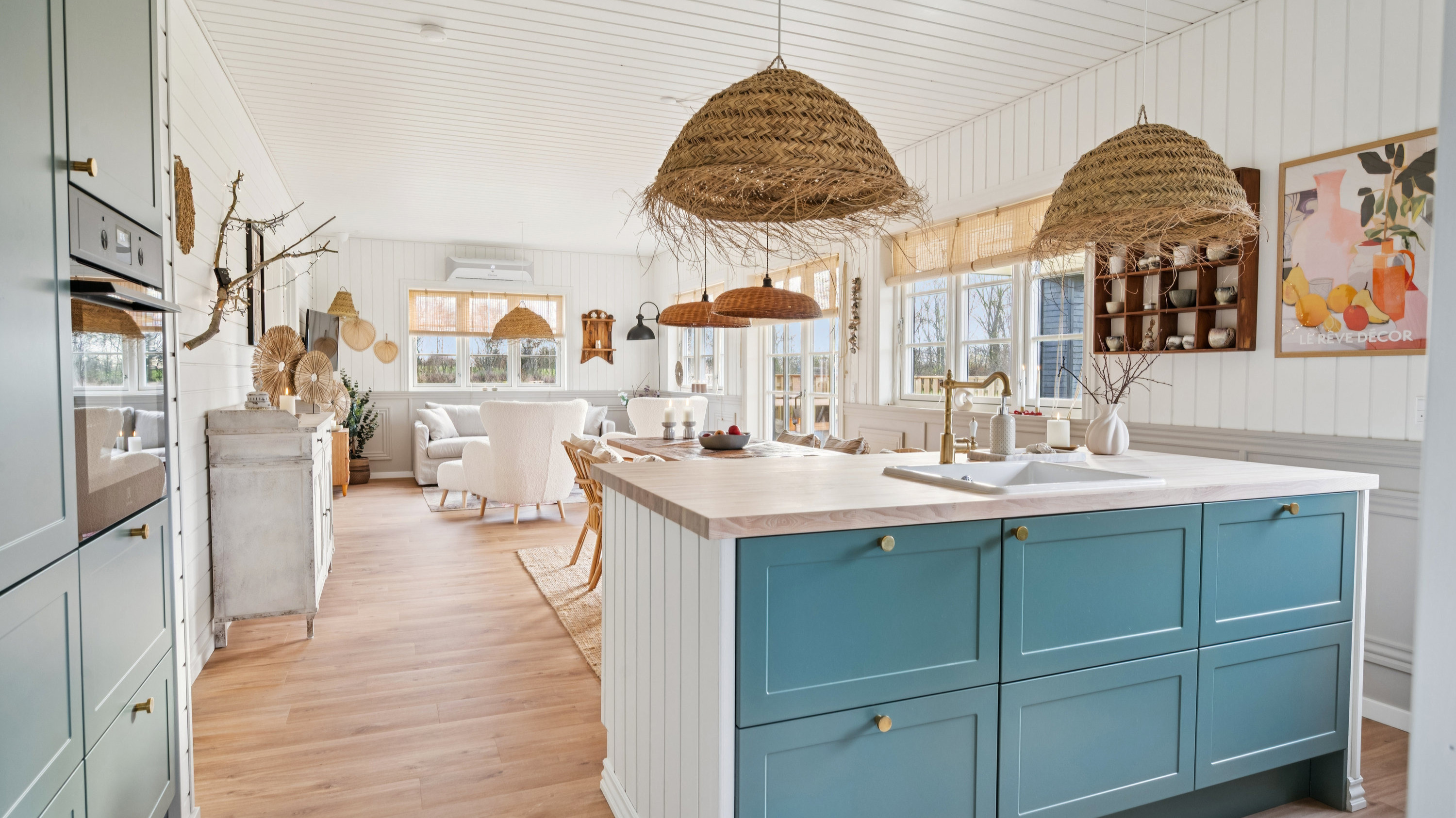 Når man træder indenfor i dette nyopførte fritidshus fra 2025, falder skuldrene automatisk ned. Her er der tale om en gennemført ferieoase, hvor hver en detalje er nøje udvalgt for at skabe en stemning af varme, ro og klassisk sommerhusidyl. Huset forener moderne komfort med en luksuriøs boheme-stil, inspireret af den velkendte og charmerende badehotelsatmosfære.