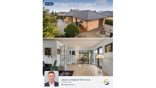 På Birke Allé 16 i Søholt, Silkeborg, venter en charmerende villa på 110 m² med en skøn, sydvendt have. Her får du et lyst køkken-alrum, en indbydende stue med flot lysindfald og en overdækket terrasse .
