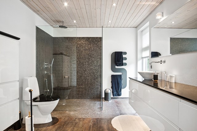 To smukt renoverede badeværelser venter på dig, begge i en yderst præsentabel stand. Derudover findes tre værelser, alle med store vinduer, der inviterer naturens omgivelser ind.