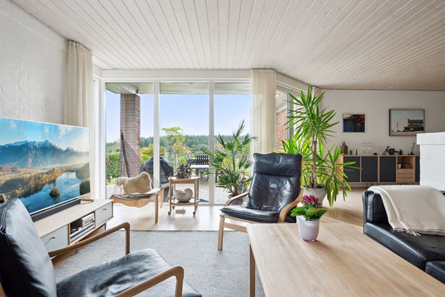 Videre fra køkkenet finder du to skønne stuer, adskilte med elegante detaljer og vinduespartier, der lader lyset strømme ind og giver adgang til udsigtsterrassen.