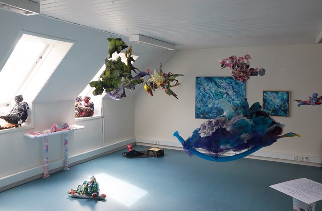 Miriam Kirsten Glads fantasifulde og alternative skulpturer møder dig med livsoverskud, også hvor du mindst venter det. Selv på toiletterne hænger skulpturer ned fra loftet. Miriams kunstunivers er nyskabende. Hun mærker et behov i tiden for mere glæde og fantasi. Der er så meget fokus på nytteværdi, men står den alene, kommer der til at mangle noget. Uden glæden ved at være til, giver livet slet ikke mening, er Miriams egen erfaring.