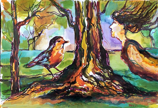 Miriam ønsker ikke at tage stilling til en hel masse med sin kunst men i højere grad at række ud i forhold til hvad, der giver livet mening og glæde. At livet i sig selv er en gave. Se rødhalsen, som lige er landet ved træets rod. Mærk den friske luft. Hendes oplevelse er, at glæde og kærlighed er en vigtig del af det at være sund og stærk. Vi bliver svækkede, hvis vi kun fokuserer på sygdom.