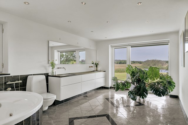 En gang forbinder opholdsrummene med værelsesafdelingerne. Det store master bedroom har vinduer med udsigt til vandet, en rummelig walk-in-garderobe med snedkerlavet inventar til tøj og sko samt adgang til et stort badeværelse med udsigt og direkte udgang til haven. Hvis der flytter børn med ind, kan de få deres egen afdeling med to gode værelser og et badeværelse samt et fællesrum, der også kan bruges som kontor.