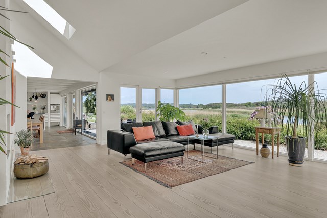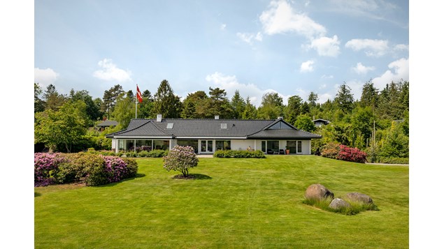 Villaen, opført i 1973, er løbende renoveret og ombygget med fokus på funktionalitet, rummelighed og kvalitet. De store, sammenhængende opholdsrum er åbnet op, så lyset strømmer ind fra flere sider, og udsigten kommer til sin ret, uanset om du står i Multiform-køkkenet, sidder ved spisebordet under loftsbjælkerne eller hygger med familien i opholdsstuen, hvor loftet går til kip.