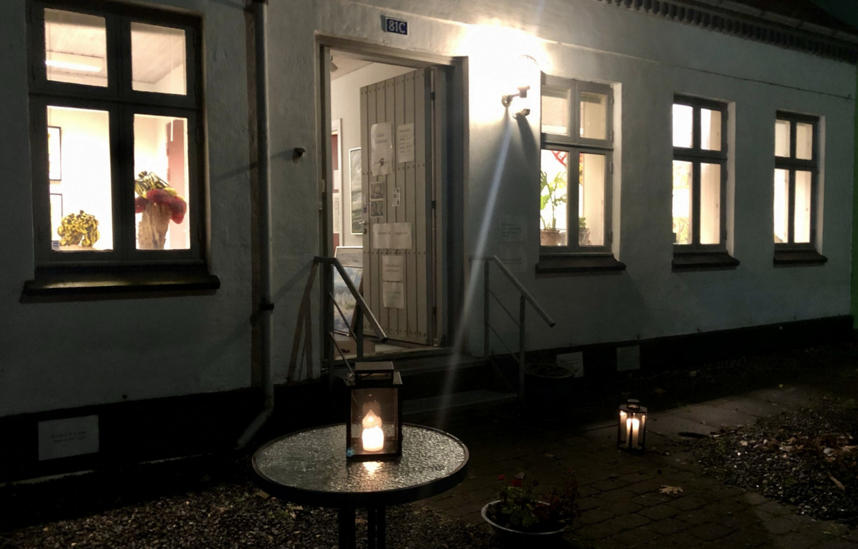 I den mørke tid lyser vinduerne op i Gladkunst, Vestergade 81 C. Det gamle hus er lidt som et levn fra gamle dage som fra en eventyrfortælling.