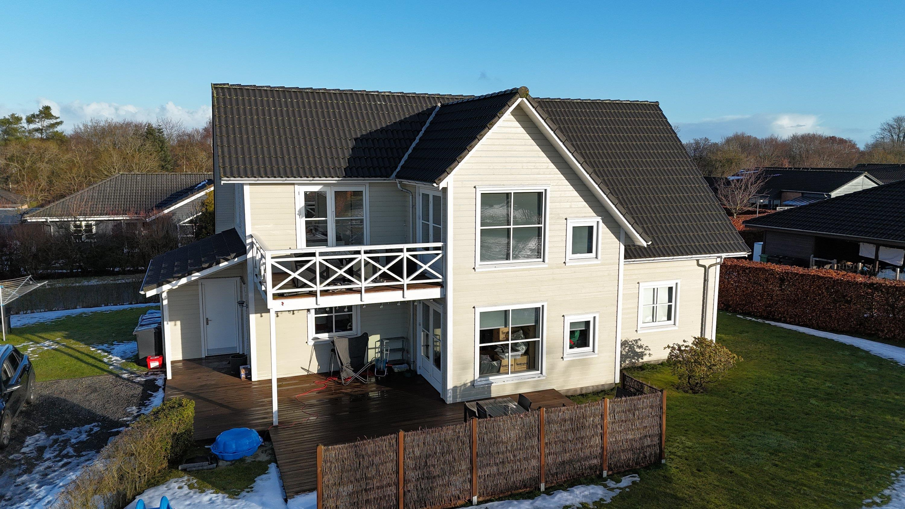 Ovenlys på 1. sal og store vinduespartier lader dagslyset strømme ind og skaber en varm, indbydende atmosfære. Den solrige altan bliver hurtigt favoritstedet til morgenkaffen, grillaftener eller et stille øjeblik med udsigt over haven — et ekstra “rum” der forlænger ude-perioden.