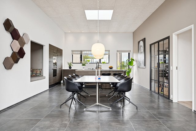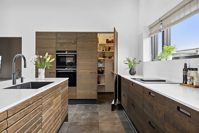 Køkkenet er hjertet af huset med en elegant indretning og moderne faciliteter, og den hyggelige alkove tilføjer en ekstra dimension af samvær og charme. Dertil byder køkkenet på et praktisk skjult viktualierum med ekstra opbevaringsplads. Dette hjem er klar til enhver lejlighed, med elegant indbygget vinreol i køkkenet.