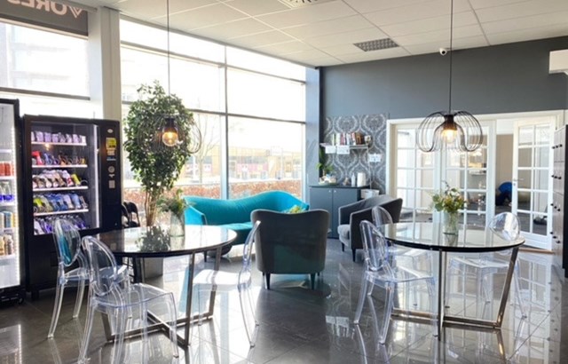 Loungeområde, hvor medlemmerne nyder gratis te, kaffe, kakao og rundstykker (Foto: Vores Fitness Silkeborg)