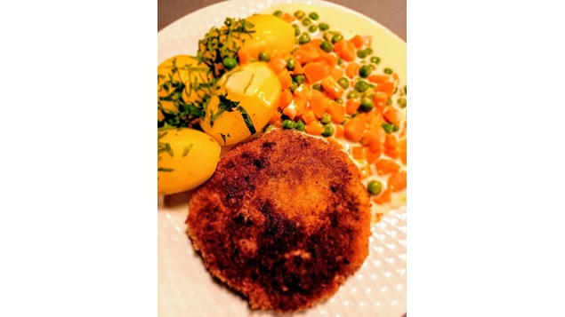 Smørstegt karbonade( 200 g.)Med stuvet ærter og gulerødder, samt danske kartofler vendt med persille .