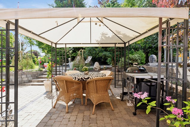 Udenfor venter en flot anlagt have med grønne arealer og en dejlig terrasse, hvor man kan nyde solen i fred og ro. Den dobbelte garage og brede indkørsel giver rigelig plads til både biler og gæster.
