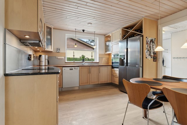 Køkkenet er lyst og funktionelt med granitbordplade, kvalitets hårde hvidevarer og masser af skabsplads – perfekt til familiens hverdag. Badeværelset har både bruseniche, gulvvarme og god opbevaring, og derudover findes gæstetoilet samt et praktisk bryggers med mange skabe.