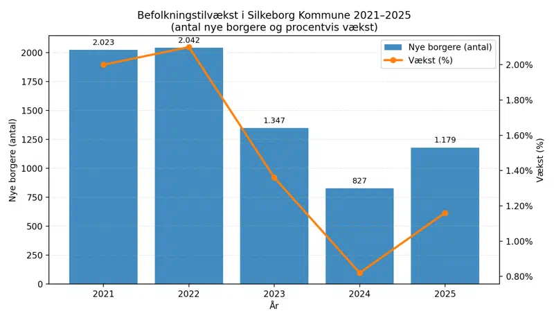 Ifølge de nyeste tal fra Danmarks Statistik steg befolkningstallet i Silkeborg Kommune fra 101.574 borgere den 1. januar 2025 til 102.753 borgere den 1. januar 2026. Det svarer til en stigning på 1.179 borgere eller 1,16 procent i løbet af 2025.