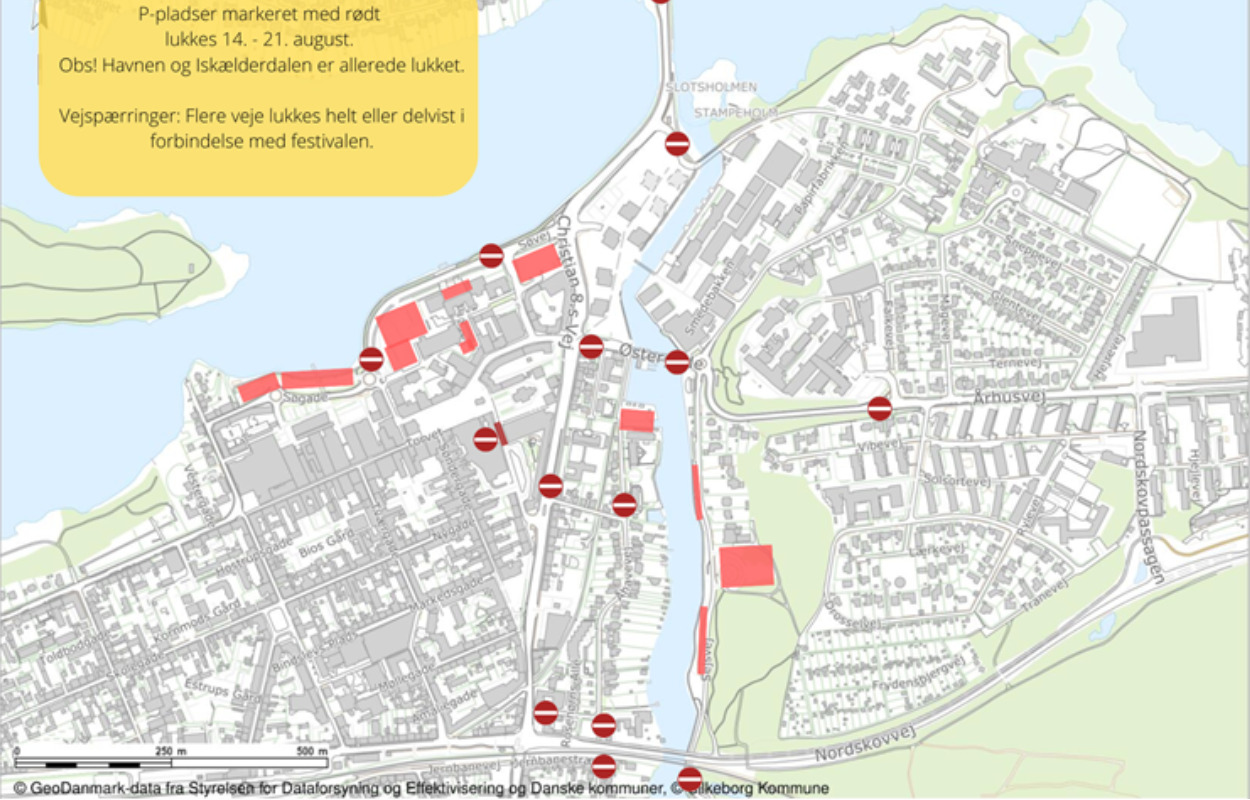 Havneparkeringen og Iskælderdalen er allerede spærret af. Fra i går, søndag 14. august, og til søndag 21. august bliver alle offentlige p-pladser langs Søvej og Søgade spærret af.