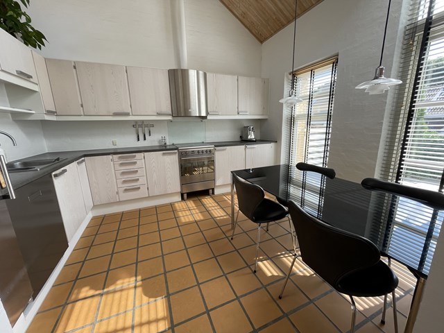 Boligen rummer flere gode værelser med en behagelig loftshøjde, hvilket skaber en luftig atmosfære. Træelementer i gulve, vinduer og køkken tilføjer en naturlig varme til rummene. Derudover et kontor/disp. rum på øverste etage.