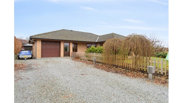 De tre værelser og to badeværelser er placeret i to separate afdelinger, så forældre og børn kan indrette sig i behagelig afstand til hinanden. Udtrykket er flot og velholdt hele vejen rundt, og det gælder også for det uundværlige bryggers. Herfra har I en direkte forbindelse ud til den store, fuldmurede garage med ekstra muligheder.