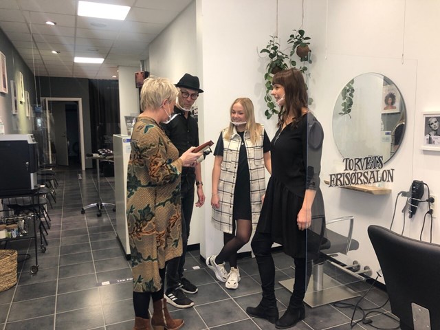 “Vi anvender gennemsigtige plastik-forhæng mellem kunderne i alle vores saloner, og det er det samme mellem dem, som venter på at komme til. Alle mine medarbejdere bærer visir, og kunderne får plastikforklæder på, når de bliver klippet og farvet.”