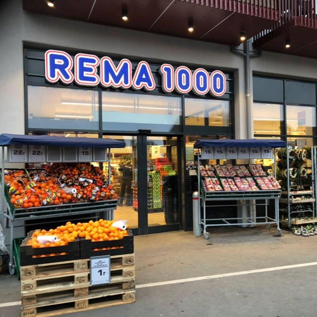 Foto: Facade indgang af den velholdte Rema 1000 butik på Lyngbygade