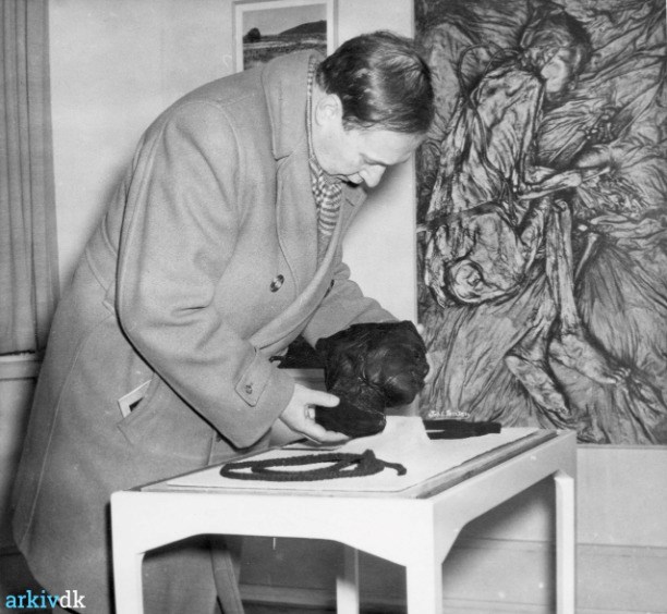 Foto: Arkiv.dk / Konservator cand.mag Knud Thorvildsen afhenter Tollundmandens hoved og tovværket, som var omkring hans hals da han blev fundet