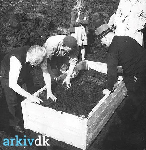 Foto: Arkiv.dk / Her ses fundet af Tollundmanden og hvordan man placerer ham i den transportable kasse
