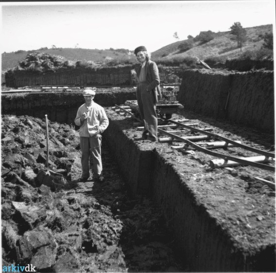 Foto: Arkiv.dk / Viggo og Grethe Højgaard på stedet i mosen, hvor de fandt Tollundmanden
