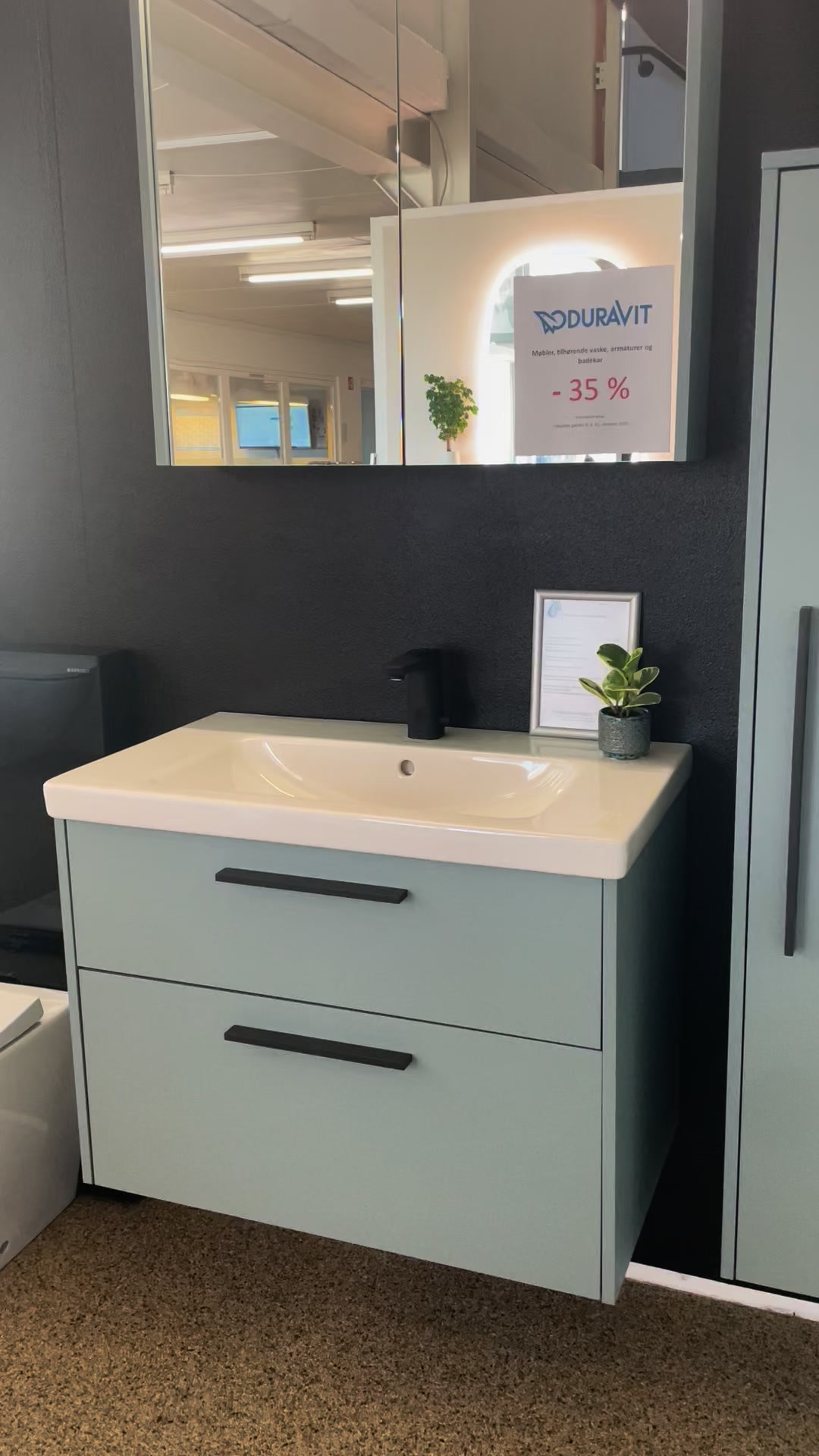 Se lige hvad vi får sat op i udstillingen i dag. Dette smukke nye badekar fra Mora med farvet front, som vi har fået lavet i samme smukke fjordgrønne farve som Duravit D-Code møblerne. Er det ikke bare super flot