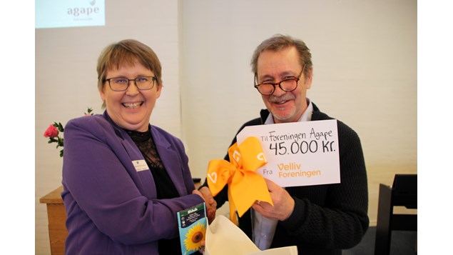 En smilende landsleder i Foreningen Agape fik lørdag overrakt en check på 45.000 kr. af Kim-Rehné Hjort Nielsen fra Velliv Foreningens repræsentantskab.